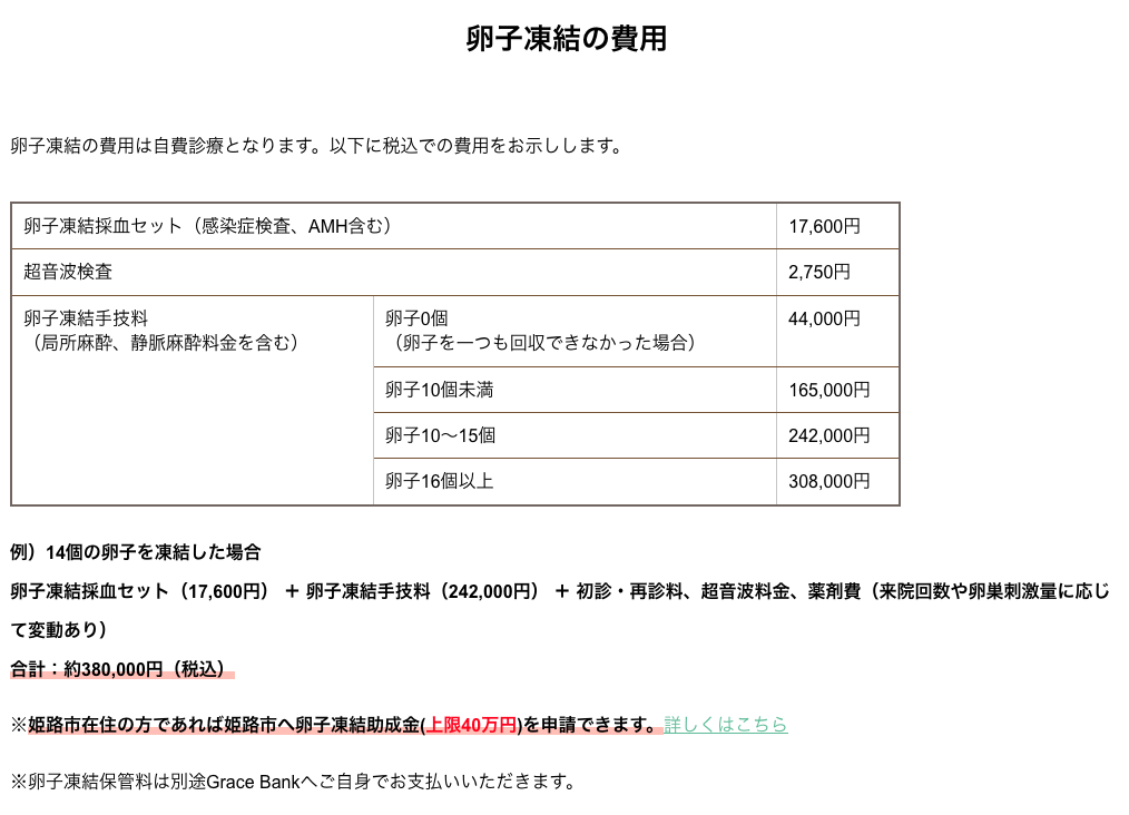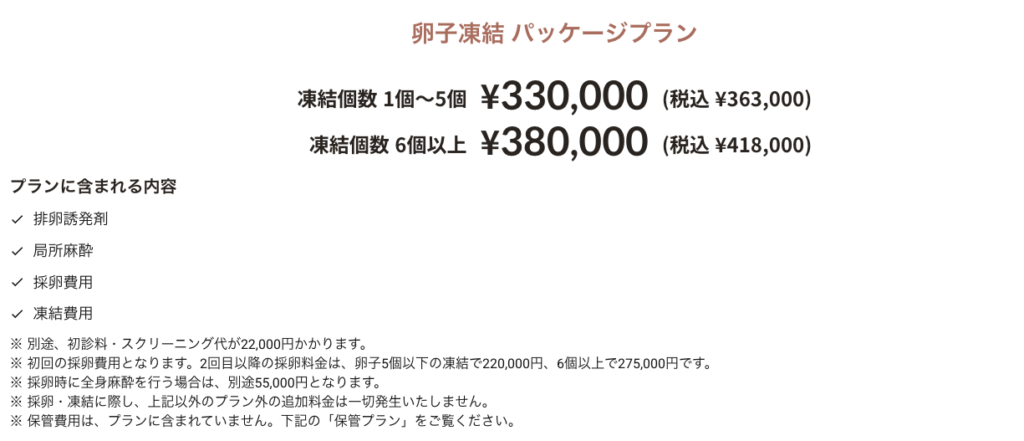 で、6個以上であれば料金は均一で、追加費用はかからない設定でした(凍結卵子の保管費用は、卵子の個数に従い増額するが、それも保管プランにより異なる)。