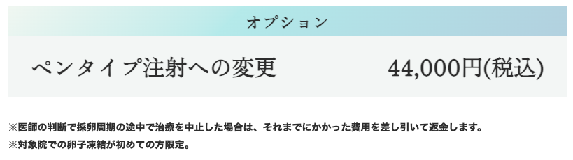 例えば、ポイント1で出てきた「にしたんARTクリニック」の「卵子凍結トライアルプラン」の場合、ペンタイプ注射への変更はオプション料金がかかります。
